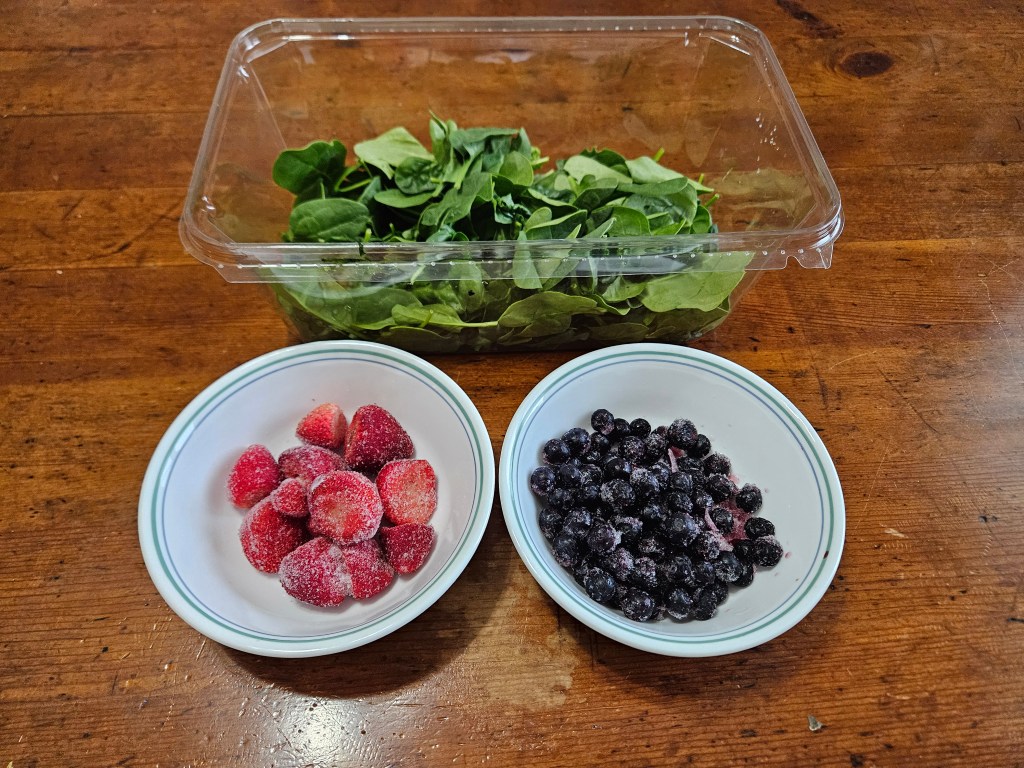 Today, I had a bit of left over spinach and I’ll be heading out for the weekend – so I need to use it up before I leave. I always keep frozen fruit in the freezer for just an instance.